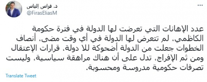 وقال في تغريدة عبر "تويتر" رصدها "المشهد العربي": "عدد الإهانات التي تعرضت لها الدولة في فترة حكومة الكاظمي، لم تتعرض لها الدولة في أي وقت مضى، أنصاف الخطوات جعلت من الدولة أضحوكة للا دولة".