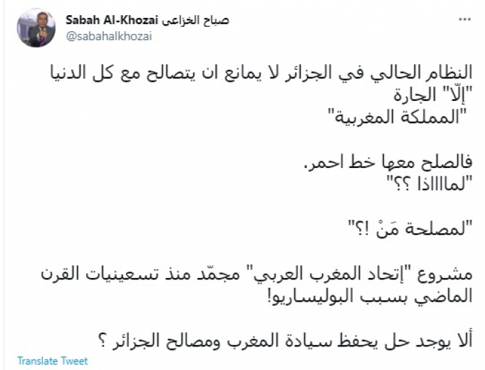علق الأكاديمي والسياسي العراقي الدكتور صباح الخزاعي، اليوم، على عدم محاولة الجزائر لحل أزمتها مع المغرب.