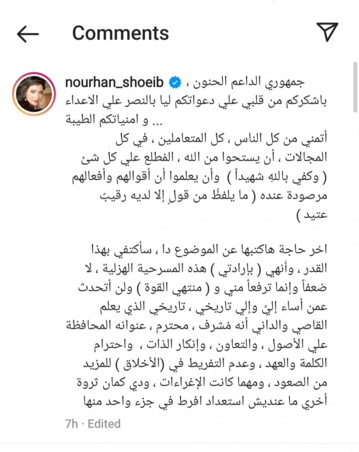 وجهت الفنانة المصرية نورهان شُعيب، رسالة شكر لجمهورها بعد دعمها في أزمتها الأخيرة مع أحد المنتجين بسبب تأخر مستحقاتها المالية.