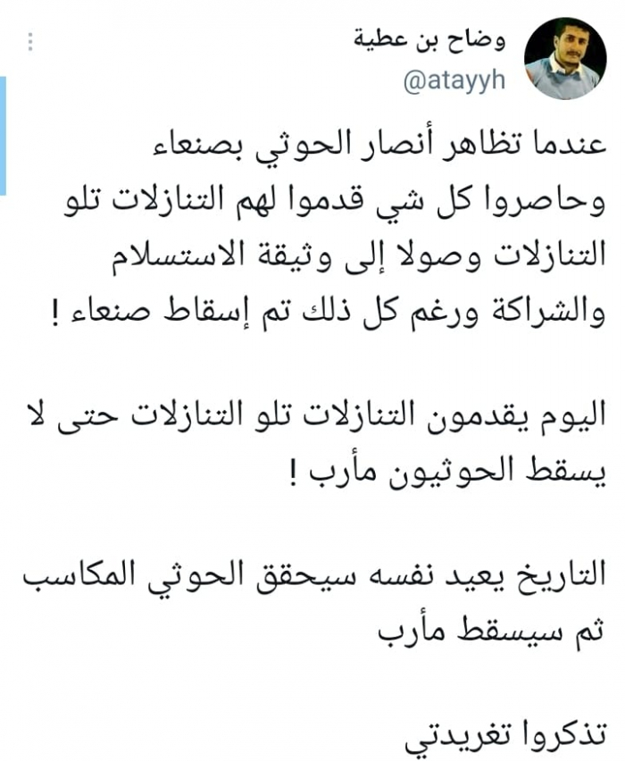 وأشار إلى أنه: "اليوم يقدمون التنازلات تلو التنازلات حتى لا يسقط الحوثيون مأرب"، مضيفا أن: "التاريخ يعيد نفسه سيحقق الحوثي المكاسب ثم سيسقط مأرب"، مختتما: "تذكروا تغريدتي".
