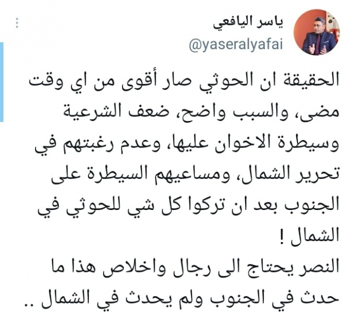أكد الكاتب الصحفي ياسر اليافعي أن قوة مليشيا الحوثي المدعومة من إيران، ناتجة من ضعف الشرعية وخضوعها لتنظيم الإخوان الإرهابي، ورفضها تحرير الشمال.