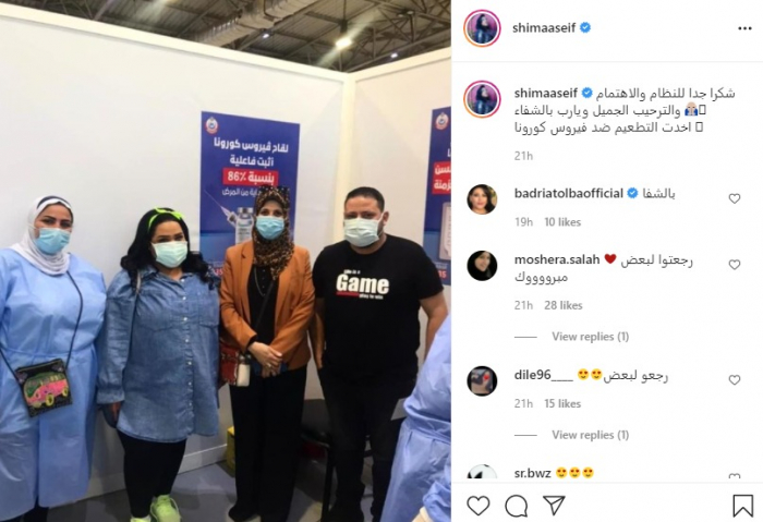ونشرت "شيماء" عبر حسابها بانستجرام، صورة لها بعد تلقي اللقاح، وعلقت: "شكرًا جدًا للنظام والاهتمام والترحيب الجميل، ويا رب بالشفاء ..أخدت التطعيم ضد فيروس كورونا".