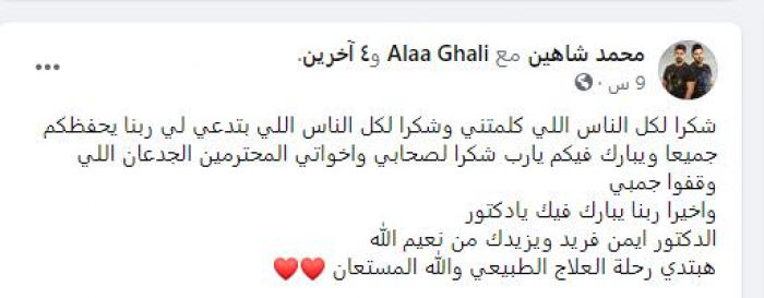وكتب "شاهين" عبر حسابه الرسمي بموقع فيسبوك: "شكرًا لكل الناس اللي كلمتني ولكل الناس اللي بتدعي لي ربنا يحفظكم جميعًا ويبارك فيكم يارب.. شكرًا لصحابي وأخواتي المحترمين الجدعان اللي وقفوا جمبي".