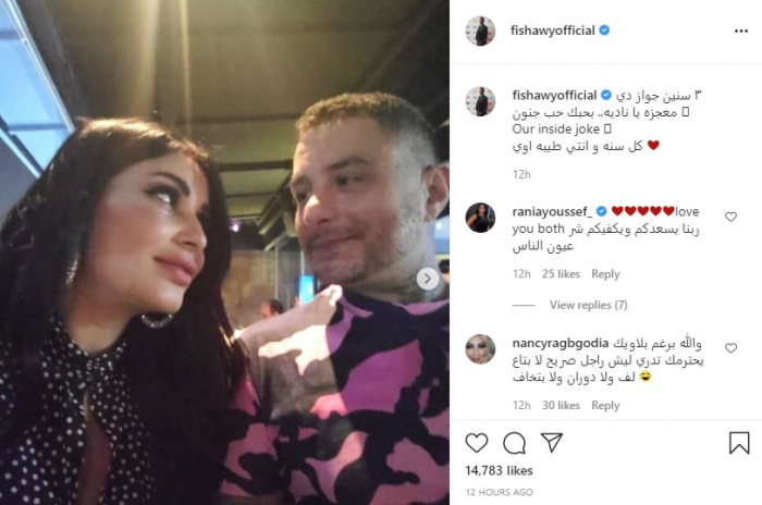 ونشر الفيشاوي عبر حسابه بموقع "انستجرام"، صور تجمعه بزوجته، وعلق :" 3 سنين جواز، دي معجزة يا نادية، بحبك حب جنون، كل سنة وأنتِ طيبة أوي".