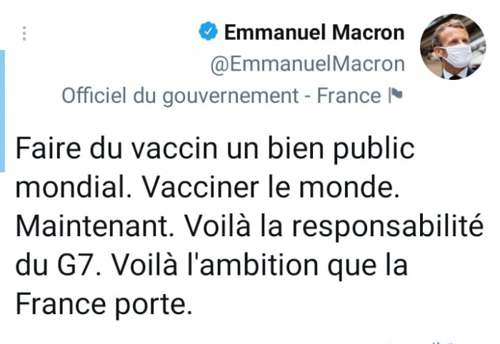 وأوضح في تغريدة على حسابه بموقع التدوين المصغر تويتر، اليوم أن: "جعل اللقاح منفعة عامة عالمية، لتلقيّح الجميع الآن، مسؤولية مجموعة السبع"، مختتما: "هذا هو طموح فرنسا".