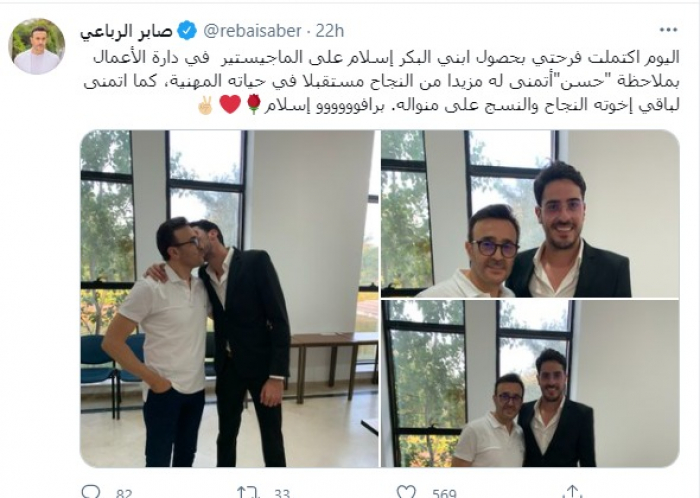 هنأ النجم التونسي صابر الرباعي، نجله الأكبر "إسلام" بحصوله على درجة الماجستير في إدارة الأعمال.