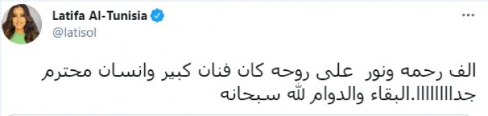 وكتبت لطيفة، عبر حسابها على تويتر: "ألف رحمة ونور على روحه.. كان فنان كبير وإنسان محترم جدًا.. البقاء والدوام لله سبحانه".