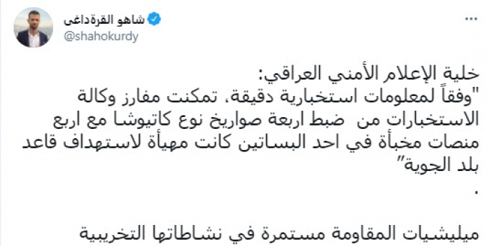 وقال في تغريدة عبر "تويتر" رصدها "المشهد العربي": "خلية الإعلام الأمني العراقي: وفقاً لمعلومات استخبارية دقيقة، تمكنت مفارز وكالة الاستخبارات من ضبط اربعة صواريخ نوع كاتيوشا مع اربع منصات مخبأة في احد البساتين كانت مهيأة لاستهداف قاعد بلد الجوية.
