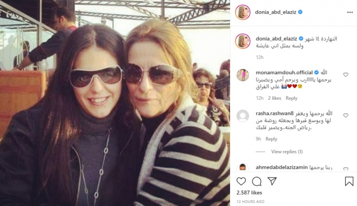 ونشرت دنيا صورة تجمعها بوالدتها عبر حسابها الرسمي بموقع "انستجرام"، وكتبت :" النهاردة ١٤ شهر ولسه بمثل إني عايشة".