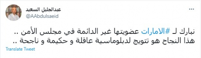 وكتب في تغريدة عبر "تويتر" رصدها "المشهد العربي": "نبارك للإمارات عضويتها غير الدائمة في مجلس الأمن .. هذا النجاح هو تتويج لدبلوماسية عاقلة و حكيمة وناجحة".