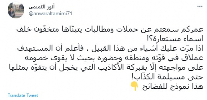 وقال في تغريدة عبر "تويتر" رصدها "المشهد العربي": " عمركم سمعتم عن حملات ومطالبات يتبنّاها متخفّون خلف أسماء مستعارة".