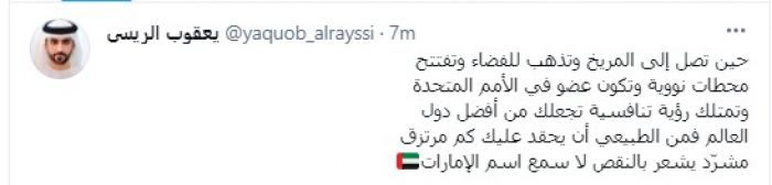وقال في تغريدة عبر "تويتر" رصدها "المشهد العربي": "حين تصل إلى المريخ وتذهب للفضاء وتفتتح محطات نووية وتكون عضو في الأمم المتحدة وتمتلك رؤية تنافسية تجعلك من أفضل دول العالم".