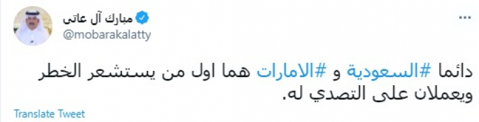 وقال في تغريدة عبر "تويتر" رصدها "المشهد العربي": "دائما السعودية والإمارات هما أول من يستشعر الخطر ويعملان على التصدي له".