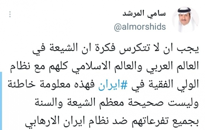 وأوضح في تغريدة على حسابه بموقع التدوين المصغر تويتر، اليوم أنه: "يجب أن لا تتكرس فكرة أن الشيعة في العالم العربي والعالم الإسلامي كلهم مع نظام الولي الفقية في إيران فهذه معلومة خاطئة وليست صحيحة".