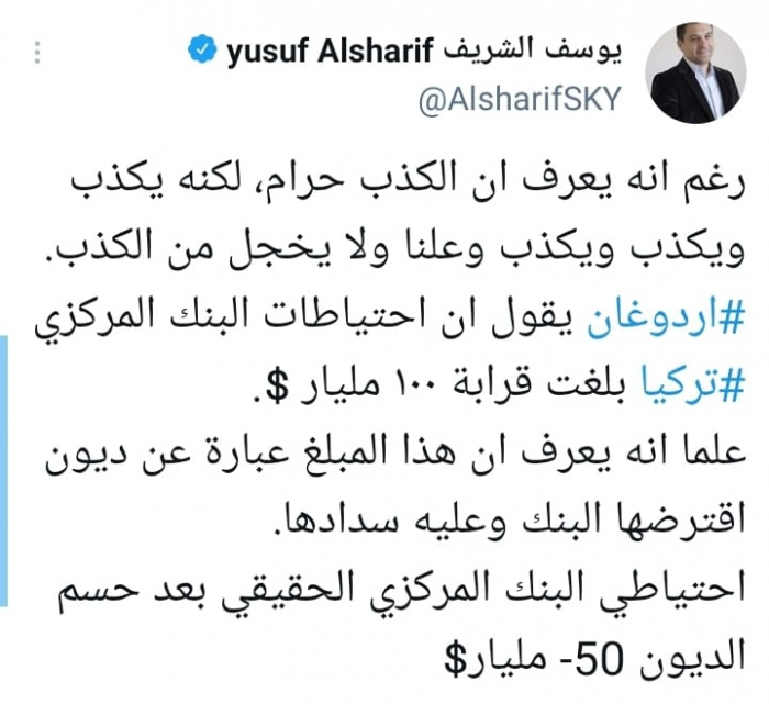 كشف الكاتب الصحفي يوسف الشريف، أكاذيب الرئيس التركي رجب طيب أردوغان حول حقيقة الاحتياطي النقدي الأجنبي.