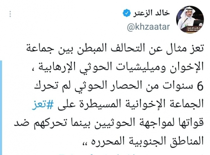 وقال في تغريدة على حسابه بموقع التدوين المصغر تويتر، اليوم إن: "تعز مثال عن التحالف المبطن بين جماعة الإخوان ومليشيات الحوثي الإرهابية".