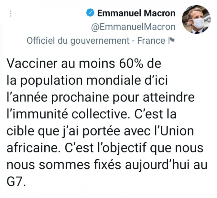 أعلن الرئيس الفرنسي إيمانويل ماكرون، اعتزام دول مجموعة السبع الكبرى، تحصين 60% من البشرية ضد فيروس كورونا في 2022.
