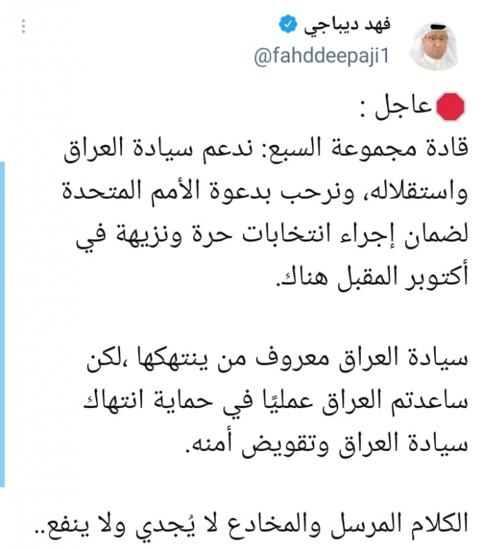 هاجم المحلل السياسي السعودي فهد ديباجي، موقف دول مجموعة السبع الكبرى من انتهاكات مليشيات إيران لسيادة العراق.