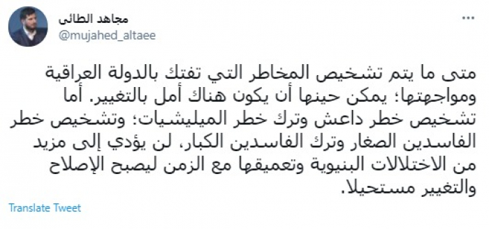 وقال في تغريدة عبر "تويتر" رصدها "المشهد العربي": "متى ما يتم تشخيص المخاطر التي تفتك بالدولة العراقية ومواجهتها؛ يمكن حينها أن يكون هناك أمل بالتغيير".