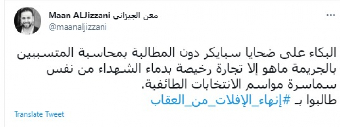 وقال في تغريدة عبر "تويتر" رصدها "المشهد العربي": "البكاء على ضحايا سبايكر دون المطالبة بمحاسبة المتسببين بالجريمة ماهو إلا تجارة رخيصة بدماء الشهداء من نفس سماسرة مواسم الانتخابات الطائفية".