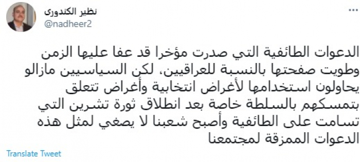 انتقد الكاتب الصحفي العراقي نظير الكندوري، اليوم، استخدام السياسيين لبعض الدعوات الطائفية وتوظيفها في أغراض انتخابية بحتة.