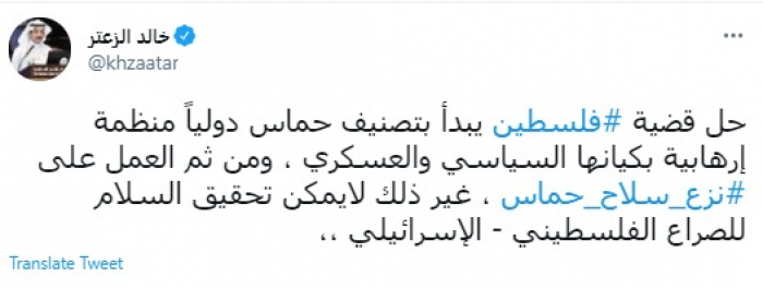 وقال في تغريدة عبر "تويتر" رصدها "المشهد العربي": "حل قضية فلسطين يبدأ بتصنيف حماس دوليًا منظمة إرهابية بكيانها السياسي والعسكري ومن ثم العمل على نزع سلاح حماس".