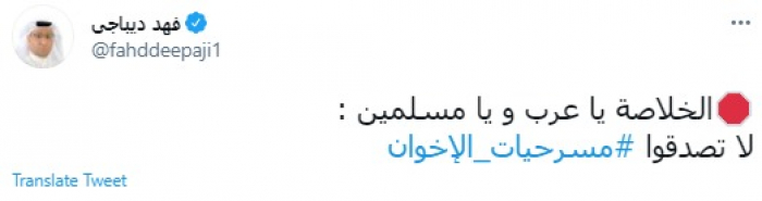 وقال في تغريدة عبر "تويتر" رصدها "المشهد العربي": "الخلاصة يا عرب و يا مسلمين: لا تصدقوا مسرحيات الإخوان".