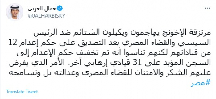 وقال في تغريدة عبر "تويتر" رصدها "المشهد العربي": "مرتزقة الإخونج يهاجمون ويكيلون الشتائم ضد الرئيس السيسي والقضاء المصري بعد التصديق على حكم إعدام 12 من قياداتهم لكنهم تناسوا أنه تم تخفيف حكم الإعدام إلى السجن المؤبد على 31 قياديا إرهابيا آخر".