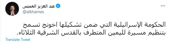 وكتب في تغريدة عبر "تويتر" رصدها "المشهد العربي": "الحكومة الإسرائيلية التي ضمن تشكيلها إخونج تسمح بتنظيم مسيرة لليمين المتطرف بالقدس الشرقية الثلاثاء".