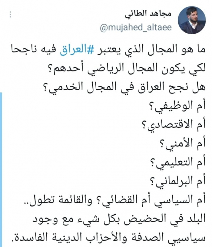 وتساءل في تغريدة على حسابه بموقع التدوين المصغر تويتر، اليوم: "ما هو المجال الذي يعتبر العراق فيه ناجحا لكي يكون المجال الرياضي أحدهم؟".
