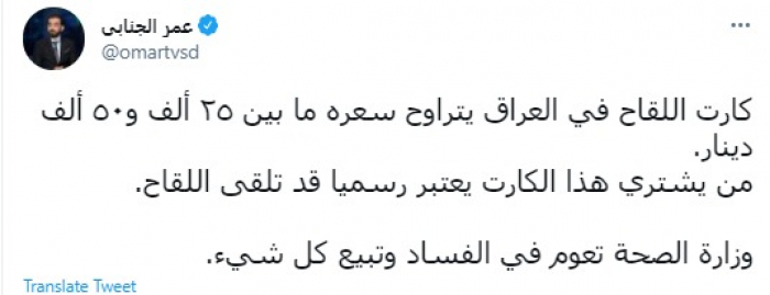 وقال في تغريدة عبر "تويتر" رصدها "المشهد العربي": "كارت اللقاح في العراق يتراوح سعره ما بين ٢٥ ألف و٥٠ ألف دينار. من يشتري هذا الكارت يعتبر رسميا قد تلقى اللقاح".