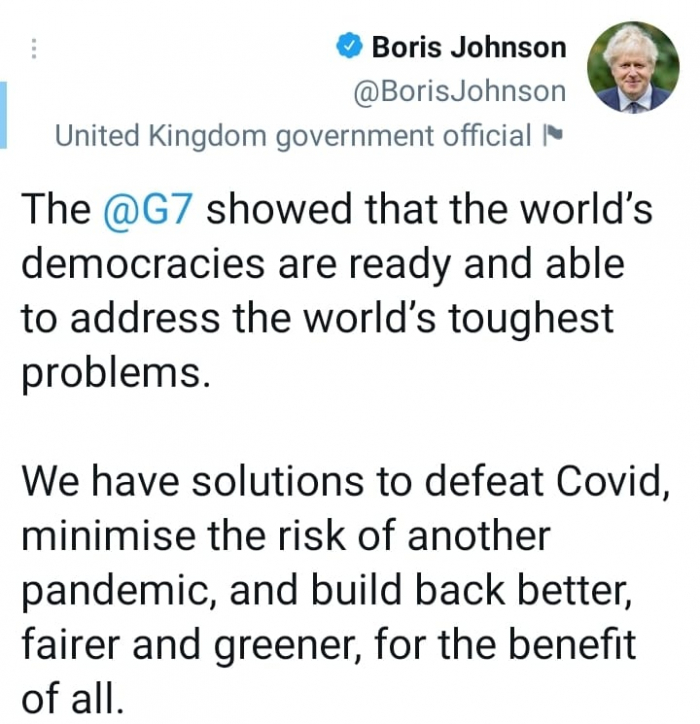 شدد رئيس وزراء بريطانيا، بوريس جونسون، على قدرة حكومات الدول السبع الكبرى، على معالجة المشكلات العالمية، وهزيمة فيروس كورونا، وخفض مخاطر ظهور جائحة جديدة.