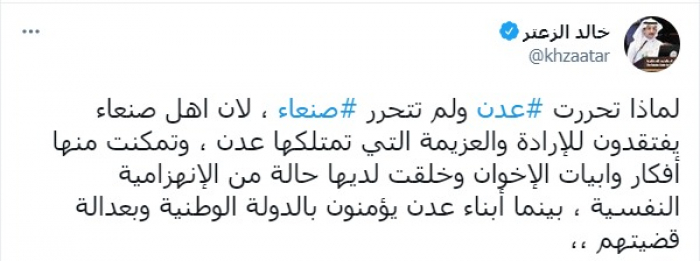 وقارن في تغريدة على حسابه بتويتر، اليوم الخميس، الوضع في المدينتين، متسائلا: "لماذا تحررت عدن ولم تتحرر صنعاء؟".