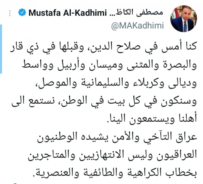 وتابع: "وسنكون في كل بيت في الوطن، نستمع إلى أهلنا ويستمعون إلينا"، مؤكدا أن: "عراق التآخي والأمن يشيده الوطنيون العراقيون وليس الانتهازيين والمتاجرين بخطاب الكراهية والطائفية والعنصرية".
