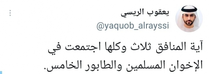 وقال في تغريدة على حسابه بموقع التدوين المصغر تويتر، اليوم إن: "آية المنافق ثلاث وكلها اجتمعت في الإخوان المسلمين والطابور الخامس".