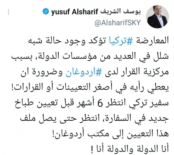 وكشف في تغريدة على حسابه بموقع التدوين المصغر تويتر، اليوم أن: "المعارضة بتركيا تؤكد وجود حالة شبه شلل في العديد من مؤسسات الدولة، بسبب مركزية القرار لدى أردوغان وضرورة أن يعطي رأيه في أصغر التعيينات أو القرارات!".