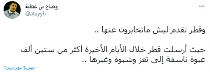 وقال في تغريدة عبر "تويتر" رصدها "المشهد العربي": "وقطر تقدم ليش ماتخابرون عنها.. حيث أرسلت قطر خلال الأيام الأخيرة أكثر من 60 ألف عبوة ناسفة إلى تعز وشبوة وغيرها".