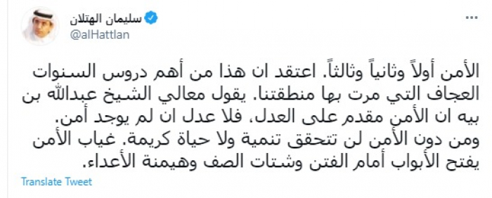 وكتب في تغريدة عبر "تويتر" رصدها "المشهد العربي": "الأمن أولاً وثانياً وثالثاً. اعتقد أن هذا من أهم دروس السنوات العجاف التي مرت بها منطقتنا. يقول معالي الشيخ عبدالله بن بيه أن الأمن مقدم على العدل، فلا عدل إن لم يوجد أمن".