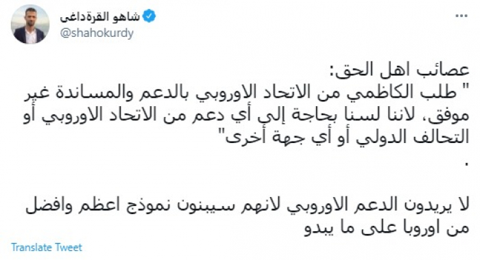 سخر الكاتب الصحفي العراقي شاهو القرةداغي، اليوم، من رفض عصائب أهل الحق للدعم الأوروبي للحكومة العراقية.