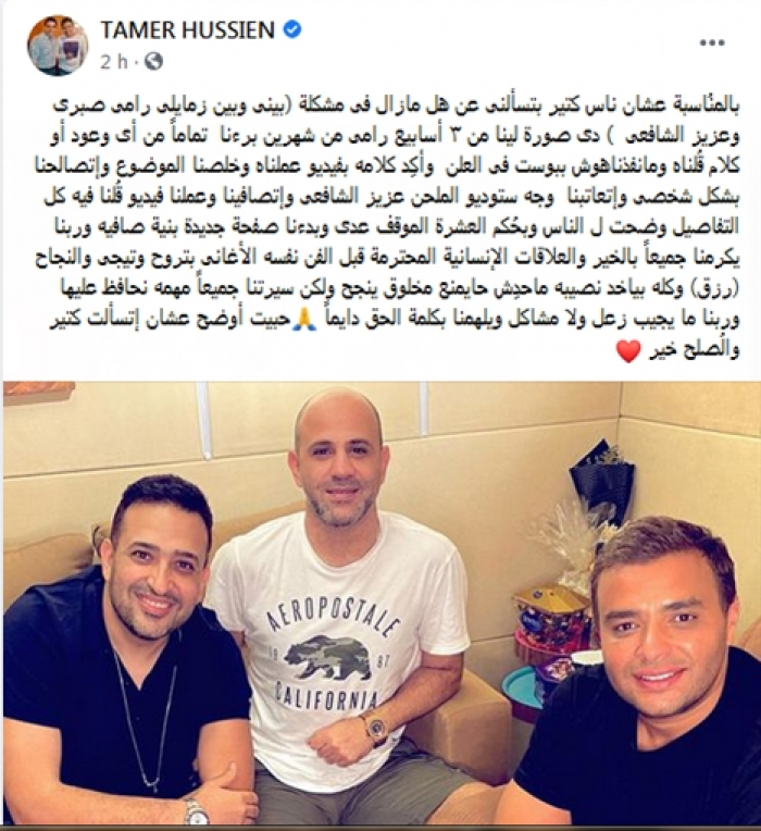 وكتب تامر هبر صفحته الرسمية بموقع "فيس بوك" :" بالمنُاسبة عشان ناس كتير بتسألنى عن هل مازال فى مشكلة (بينى وبين زمايلى رامى صبرى وعزيز الشافعى ) دى صورة لينا من ٣ أسابيع رامى من شهرين برءنا تمامًا من أى وعود أو كلام قُلناه ومانفذناهوش ببوست فى العلن وأكِد كلامه بفيديو عملناه وخلصنا الموضوع واتصالحنا بشكل شخصى واتعاتبنا وجه ستوديو الملحن عزيز الشافعى واتصافينا وعملنا فيديو قُلنا فيه كل التفاصيل ووضحنا للناس وبحُكم العشرة الموقف عدى وبدأنا صفحة جديدة بنية صافيه وربنا يكرمنا جميعًا بالخير والعلاقات الإنسانية المحترمة قبل الفن نفسه الأغانى بتروح وتيجى والنجاح (رزق) وكله بياخد نصيبه ماحدِش حايمنع مخلوق ينجح ولكن سيرتنا جميعًا مهمة نحافظ عليها وربنا ما يجيب زعل ولا مشاكل ويلهمنا بكلمة الحق دايمًا.. حبيت أوضح عشان اتسألت كتير والُصلح خير".