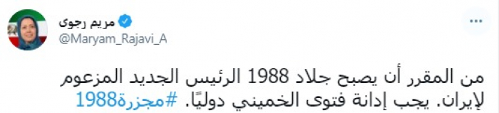 وكتبت في تغريدة عبر "تويتر" رصدها "المشهد العربي": "من المقرر أن يصبح جلاد 1988 الرئيس الجديد المزعوم لإيران. يجب إدانة فتوى الخميني دوليًا".