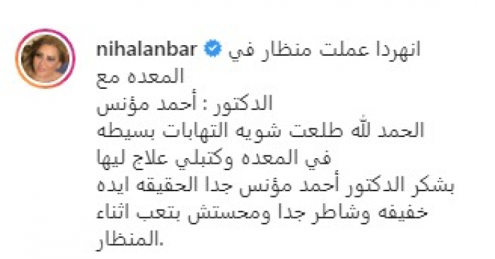 طمأنت الفنانة نهال عنبر جمهورها على حالتها الصحية، وكشفت عن إجرائها عملية منظار بسيطة في المعدة.