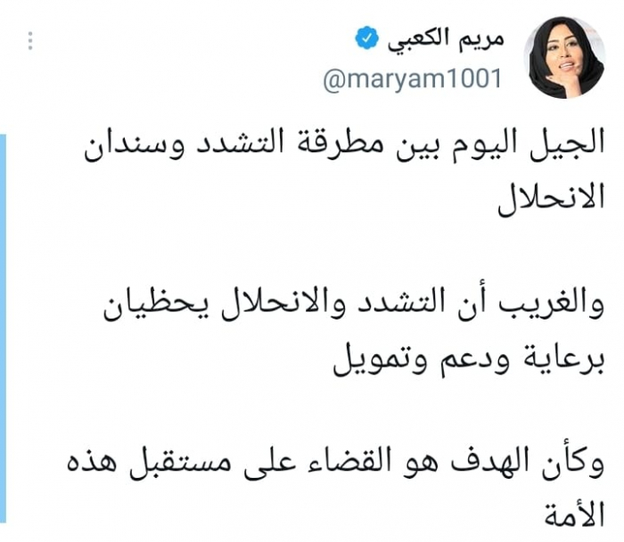 كشفت الكاتبة الصحفية مريم الكعبي، عن جهات ترعى التشدد والانحلال بين الأوساط الشبابية للقضاء على الأمة العربية.