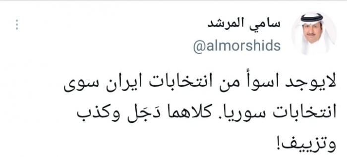 وأشار في تغريدة على حسابه بموقع التدوين المصغر تويتر، اليوم إلى أنه: " لا يوجد أسوأ من انتخابات إيران سوى انتخابات سوريا"، موضحا أن: "كلاهما دَجَل وكذب وتزييف!".