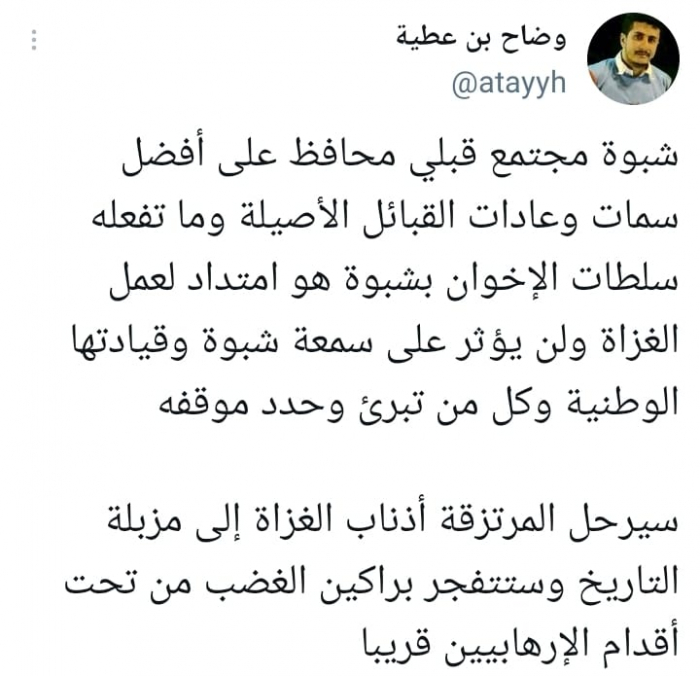 وأكد أن: "ما تفعله سلطات الإخوان بشبوة هو امتداد لعمل الغزاة ولن يؤثر على سمعة شبوة وقيادتها الوطنية وكل من تبرئ وحدد موقفه".