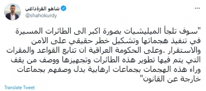 وقال في تغريدة عبر "تويتر" رصدها "المشهد العربي": "سوف تلجأ المليشيات بصورة أكبر إلى الطائرات المسيرة في تنفيذ هجماتها وتشكيل خطر حقيقي على الأمن والاستقرار".