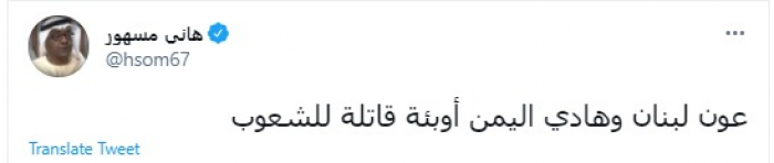وقال في تغريدة عبر "تويتر" رصدها "المشهد العربي": "عون لبنان وهادي اليمن أوبئة قاتلة للشعوب".