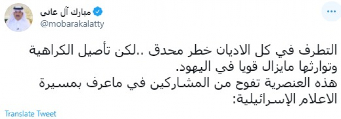 وقال في تغريدة عبر "تويتر" رصدها "المشهد العربي": "التطرف في كل الاديان خطر محدق ..لكن تأصيل الكراهية وتوارثها ما يزال قويا في اليهود".