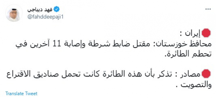 وقال في تغريدة عبر "تويتر" رصدها "المشهد العربي": "إيران: محافظ خوزستان: مقتل ضابط شرطة وإصابة 11 آخرين في تحطم الطائرة".