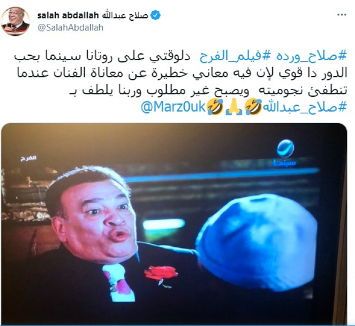 ونشر عبد الله صورة من الفيلم عبر حسابه بتويتر، وقال :"صلاح وردة، من فيلم الفرح.. بحب الدور ده قوي، لأن فيه معاني خطيرة عن معاناة الفنان عندما تنطفئ نجوميته، ويصبح غير مطلوب وربنا يلطف بصلاح عبدالله".